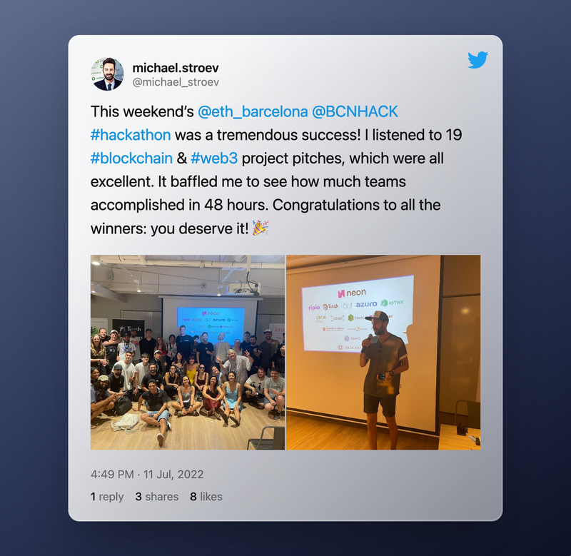 The beautiful, sunny city of Barcelone was the stage of the hackathon event that brought participants to work on subjects such as Web3 for public goods; DeFi accessibility; Infrastructure & Scalability; Regenerative Finance; and the Creator's Economy.