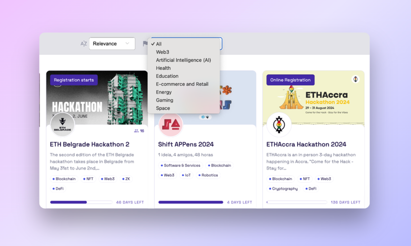 This new feature is designed to make the search for the perfect hackathon easier and seamless. Users can now filter through all listed hackathons and tailor their search to see events in the categories most relevant to them, including Web3, AI, Health, Education, E-commerce & Retail, Energy, Gaming, and Space.